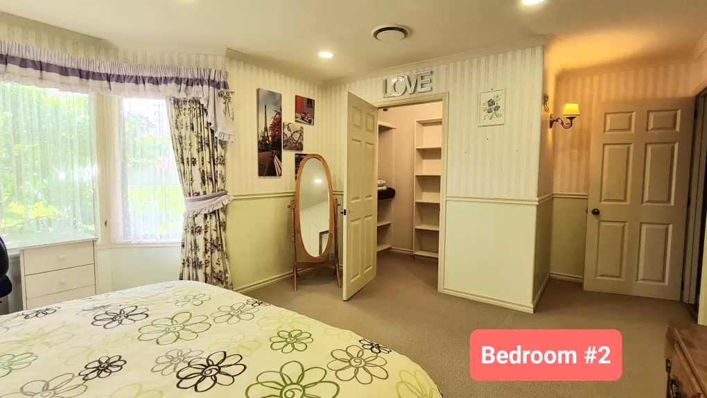 Bedroom is fully furnished with Queen bed and linens, dresser, mirrors, walk-in closet and desk. Share a bathroom only with another female boarder. Full use of large kitchen, laundry room, family living areas and outside decks.